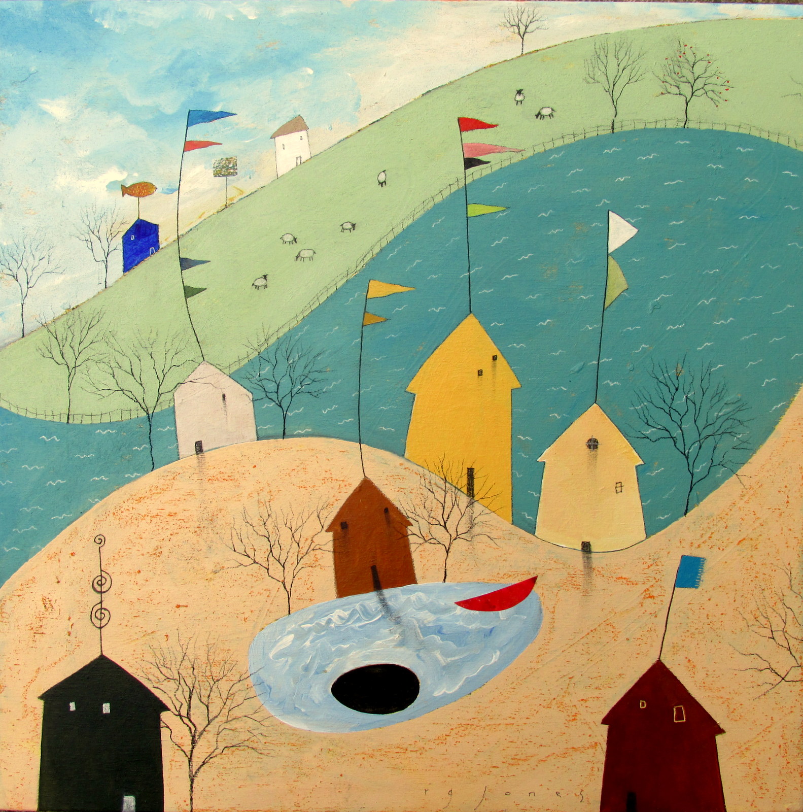 With the exception of this first painting, which is on paper, all of these new paintings are on wood panels. The panels are 2" deep and the images continue around the sides. They range in size from 10 to 12 inches square. Mostly acrylic and charcoal with some paper collage and oil pastel.